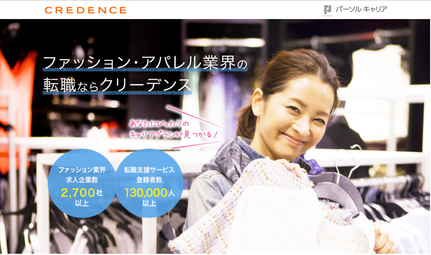 アパレル専門の転職サイトの中で最も案件数・職種数ともにが多いのがこのクリーデンスです。クリーデンスはDODAなどのキャリアのある人材向けの転職を扱っているパーソナルキャリアが展開するサイトで、カジュアルブランドから、一般人には手の届かないハイブランドまで扱っています。