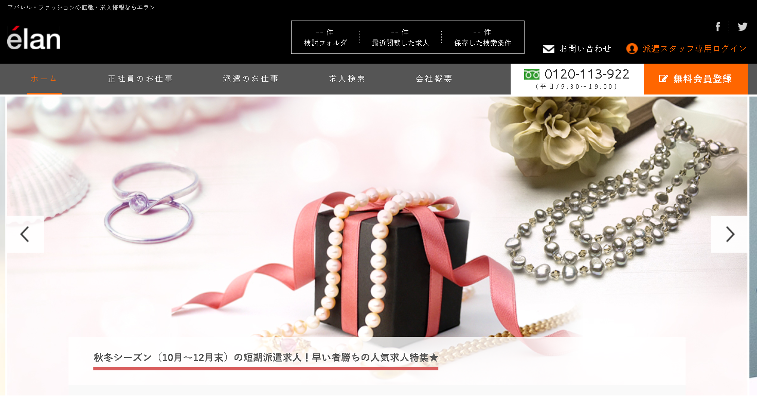 エランもファッショーネ同様、「アパレル業界のみ」の案件を扱っている転職サイトです。案件は専門職から事務、コールセンターなど様々。ファッショーネとの違いとしては、まず第一に派遣案件が多いことです。